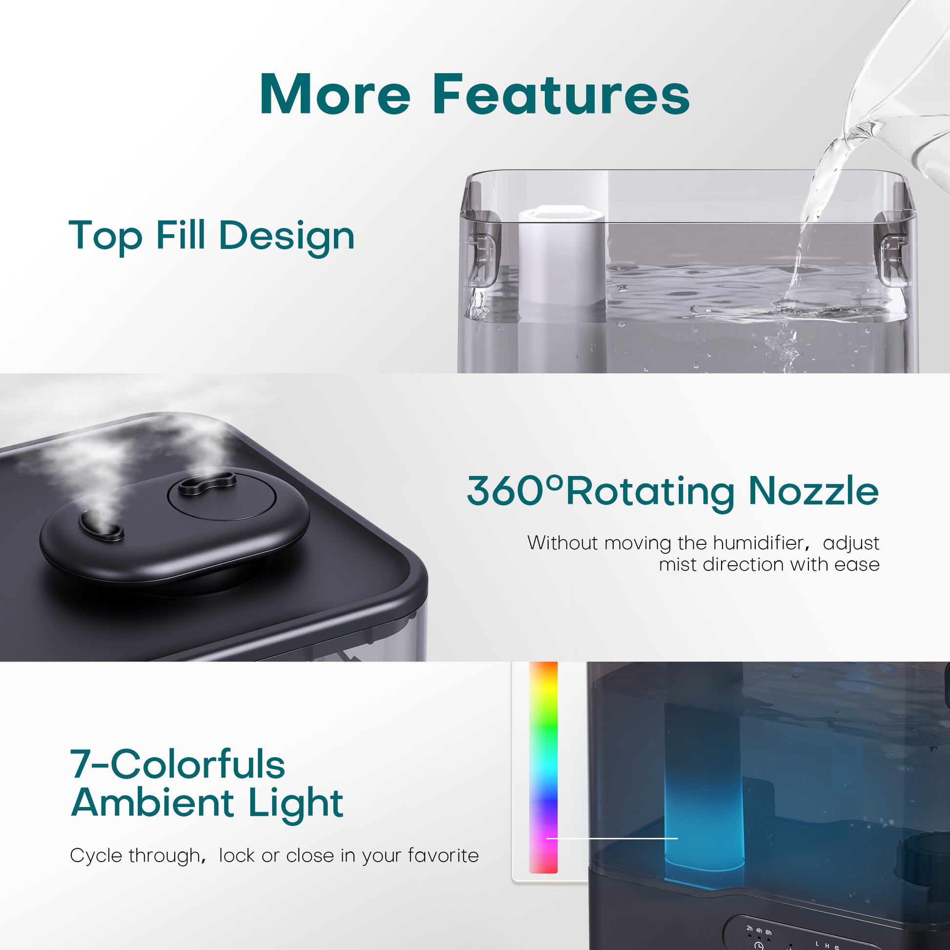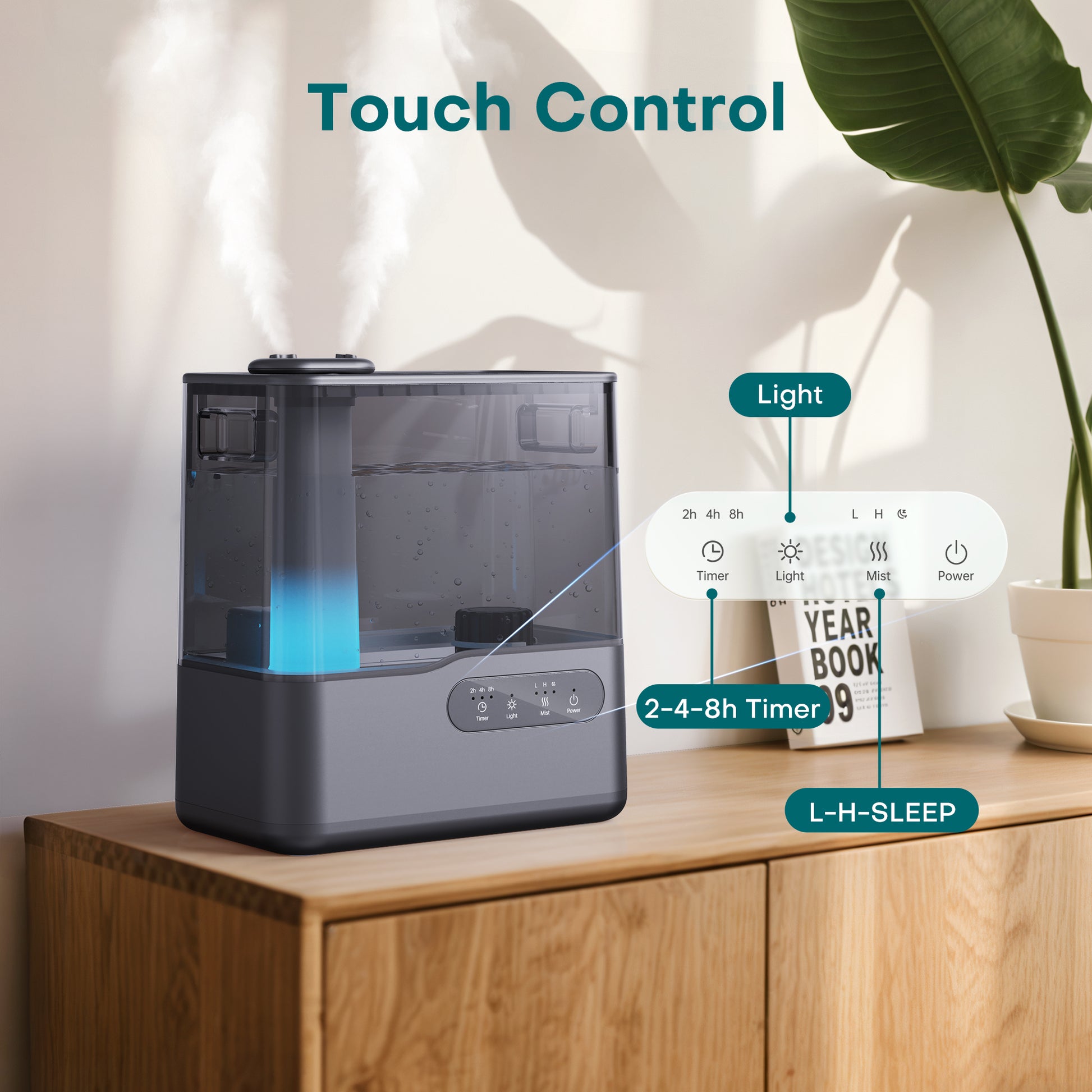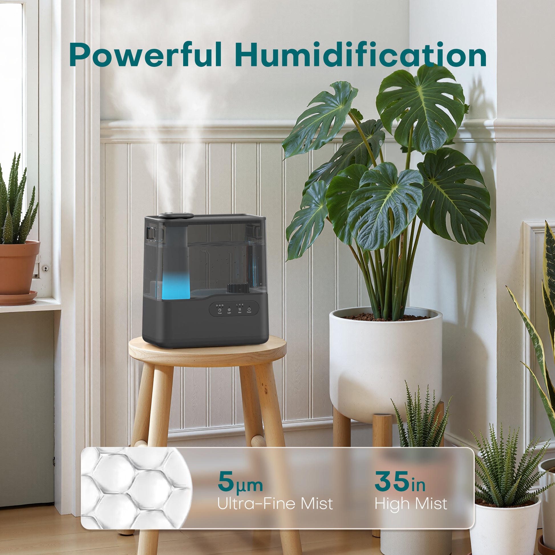 - Equipped with a 5L water tank, it delivers continuous operation for 50 hours (On the lowest mist setting), reducing the need for frequent refills,helping you avoid discomfort from congestion, coughing, or dry mouth.