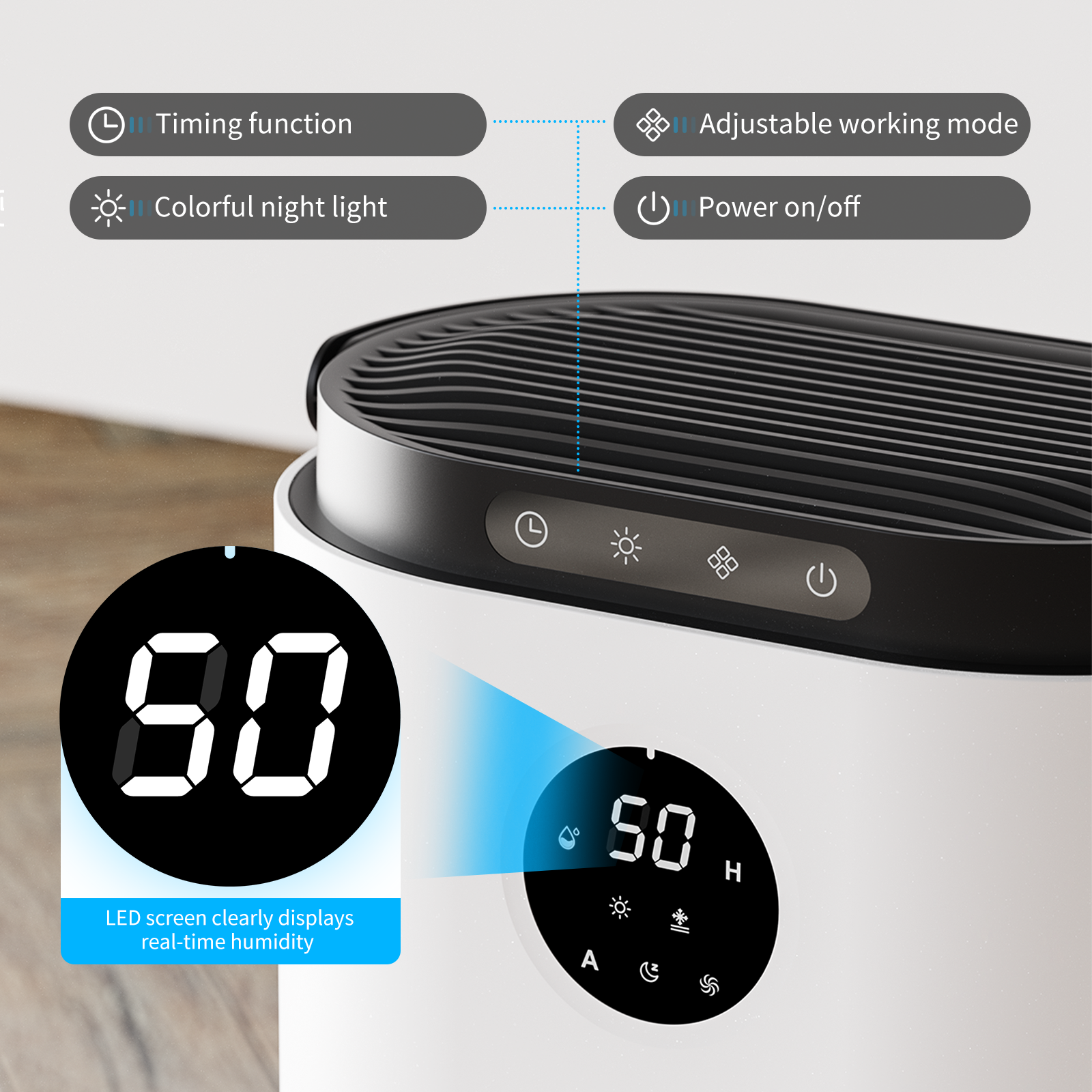 ALROCKET dehumidifier-what can it do for you?Faster and Efficient Dehumidification. Using double semiconductors, it can quickly remove up to 800ml of water at 86℉ (30°C) ,80% RH daily.Remove the unpleasant odor, dissipate sultry air, keep your bedroom, bathroom, basement, and garage air fresh. It is not only a small dehumidifier for home, but also a portable dehumidifier for RV.Effectively remove excess water in the air, improving the air quality, especially after a bath or shower. Keep the environment dry and comfortable.Control pleasant room humidity and protect your health. The most suitable humidity for people is 50-60%.The ultra-quiet Sleep Mode of this dehumidifier is perfect for the bedroom and night. Less than 35dB, just feel like in a quiet wonderland!This large dehumidifier supports setting a timer (max 48Hours)to turn off the dehumidifier.The Auto Defrost could prevent getting stuck by the low temperatures, keeps the dehumidifier working smoothly for you.Turn on the built-in 7 colors nightlight to decorate your wonderful night, also supports breathing light mode and lock colo mode.