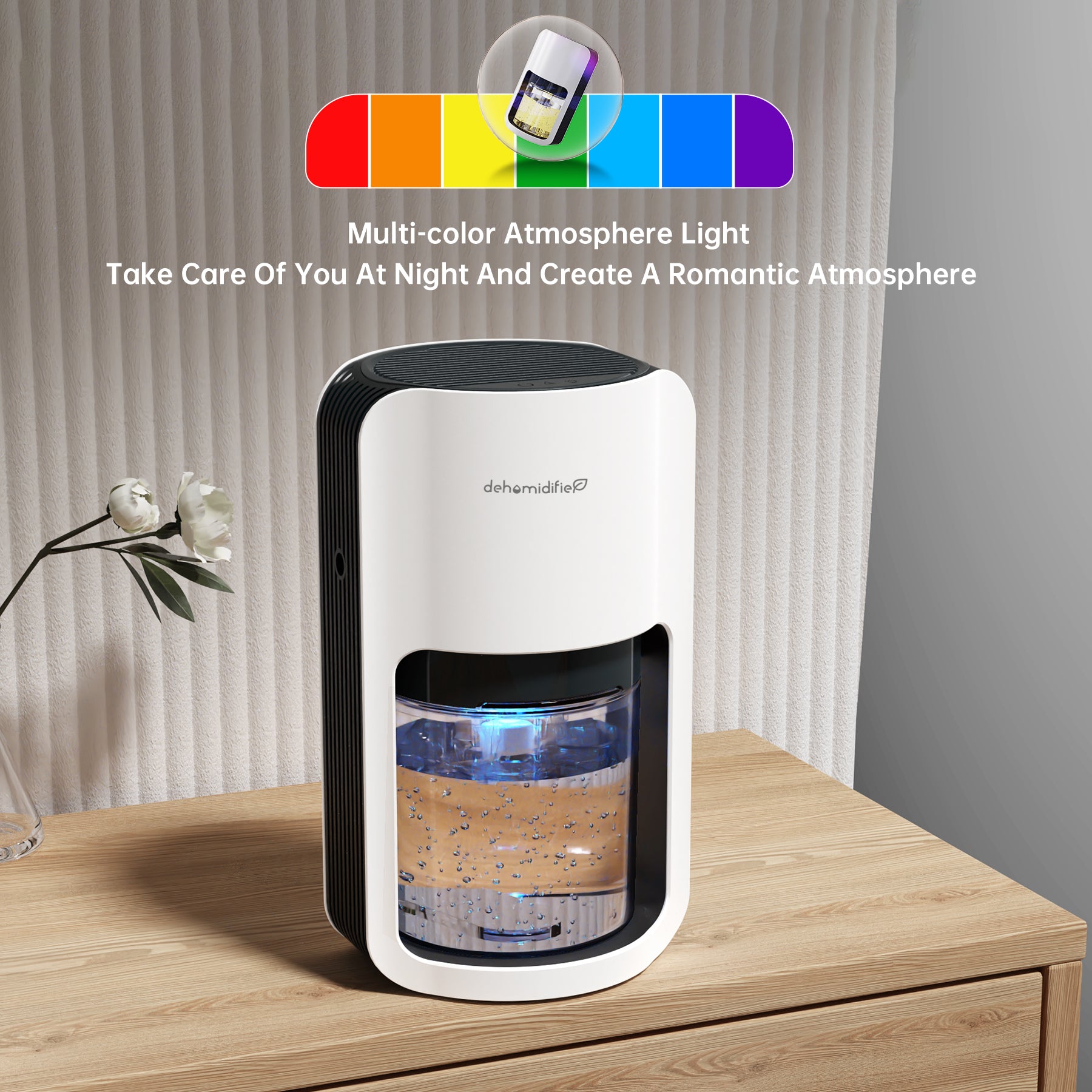 - Make Life More Fun: Rejecting the boring life and making life more interesting, our dehumidifier is designed with colorful atmosphere lights. When you turn on the dehumidifier, the brilliant colors are mapped to the surface of the water, and then the colors spread throughout the room, making you feel like you are swimming in a colorful ocean.